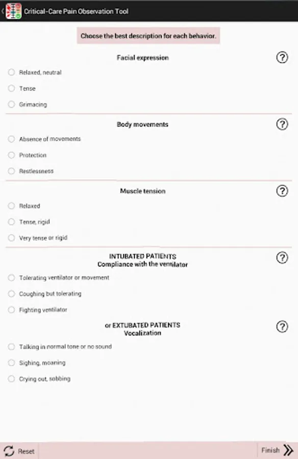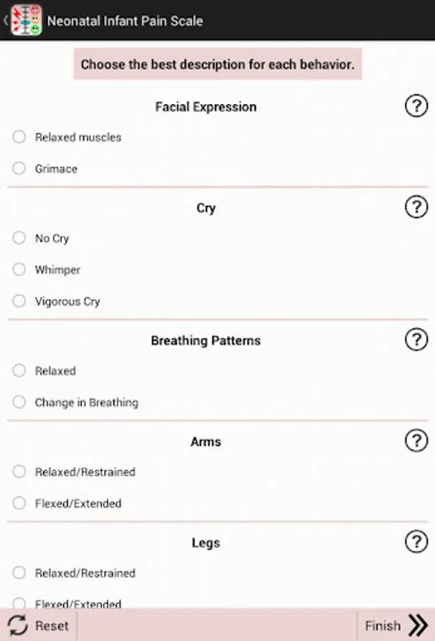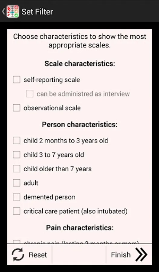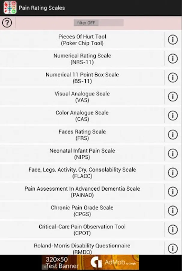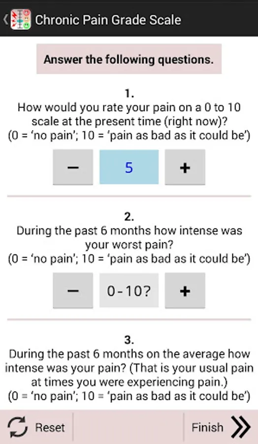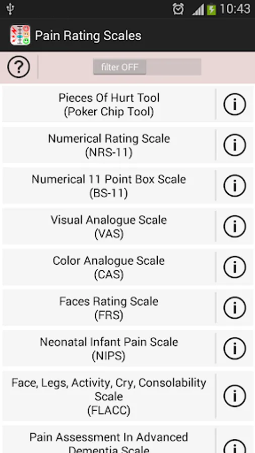 This application provides some of the most used, validated and widely accepted pain assessment and rating scales. Featured are self-reporting and observational scales for pain assessment in infant, children, adults, demented persons, ICU patients and persons experiencing chronic or low-back pain:
