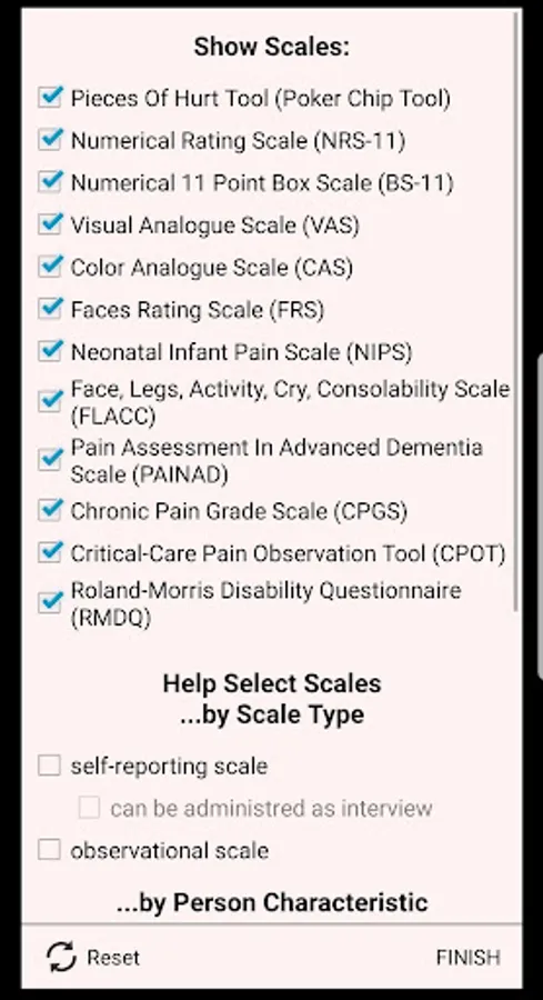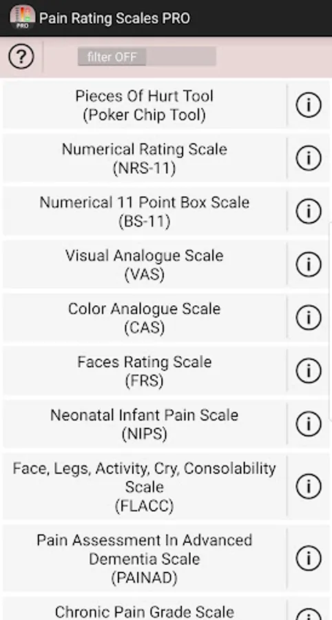This application provides some of the most used, validated and widely accepted pain assessment and rating scales. Featured are self-reporting and observational scales for pain assessment in infant, children, adults, demented persons, ICU patients and persons experiencing chronic or low-back pain: