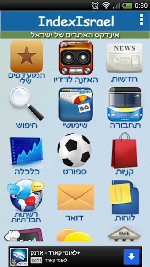 The app gathers all the websites popular and useful in various categories, this simple and convenient sites favorite at the touch of a button. Likewise you can listen to radio stations of your favorite example: Galgalatz, waves IDF, Israel Radio, Radio Tel Aviv, Radio non stop, Radius 100 FM , Eco 99 FM heartland, Gimmel Network, Radio Haifa Fire Ham Radio, Radio Oriental, Jerusalem Radio 101FM, Radio South, 88FM, Radio Kol Rega, Radio Voice of the Red Sea, mid-way radio, Radio sound level, Radio Kol Chai , Campus Voice, a network, Radio breathe east, Sound of Music, 89.1FM, Channel 7, Network D, IDC, Israel Waves, Radio Nostalgia, Radio FM and Radio Redemption Breslov voice stream.