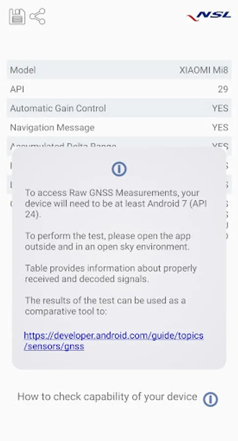 To run GNSS check, your phone needs the capability to access the raw GNSS measurements API from Android. For this, your device will need to be at least Android 7 (API 24). To perform the test, please open the app outside and in an open sky environment. The results of the test can be used as a comparative tool to: