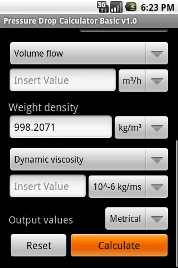 Calculates pressure drop (head loss) of a fluid, in straight circular pipes due to friction. Input parameters for this app is pipe diameter, lenght of pipe, pipe roughness (app includes default values for widely used pipes), flow rate in several expressions, and physical properties of the flow medium). At first the Darcy friction factor f,is calculated depending upon the type of flow that exist in the pipe. So, if Reynolds number is less than 2000 (laminar flow), the f=64/Re formula is used to calculate the friction factor f. If Reynolds number is more than 2000 (transition or turbulent flow), an approximation of the Colebrook equation (Swamee-Jain equation) is used in order to calculate friction factor f. Then Darcy-Weisbach equation is used finally to calculate the pressure loss.