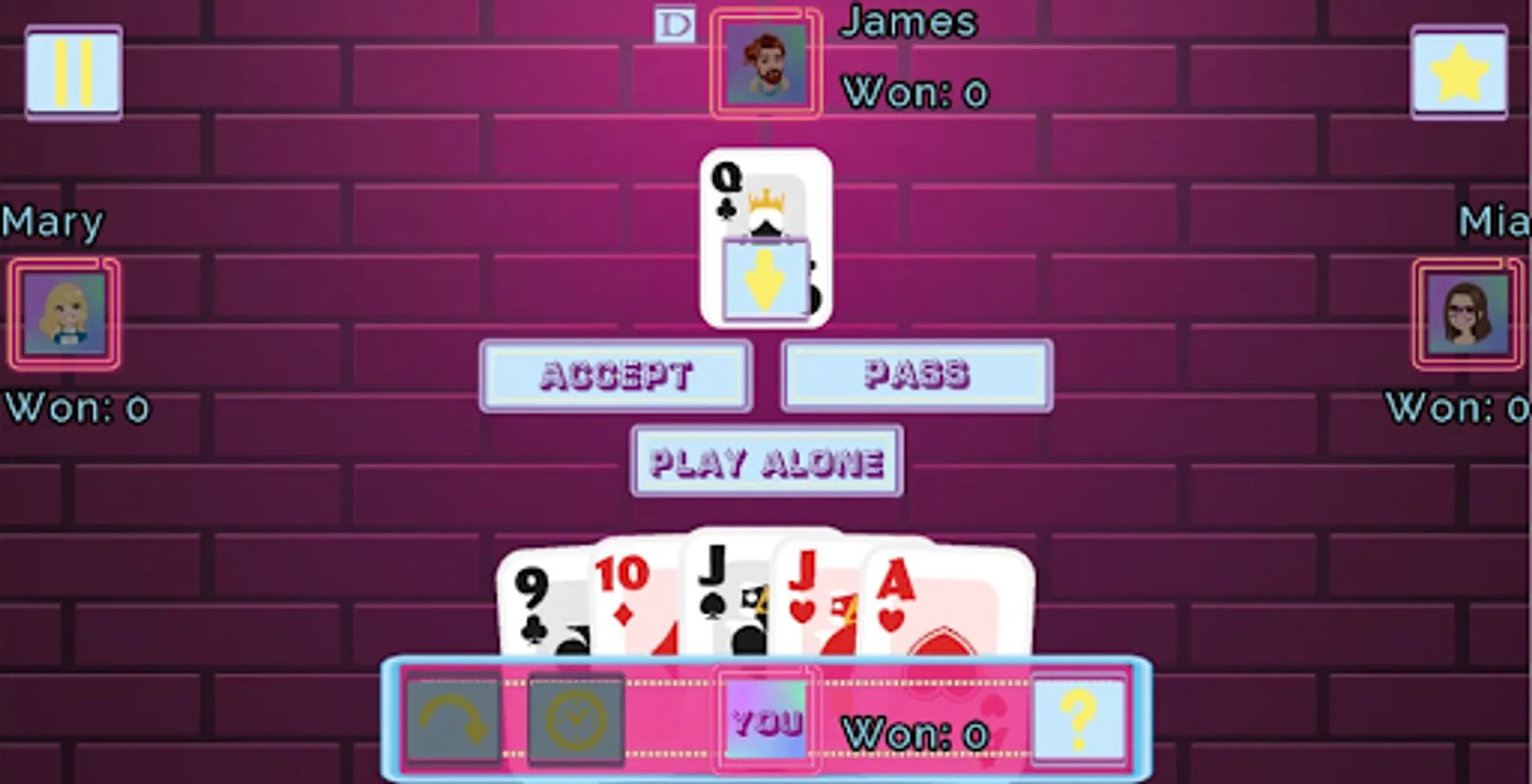 In Euchre Free, a classic card games, you play just like in real life with addict Euchre players, choosing between accepting the trump, passing or changing your cards, playing the match with your partner or going alone. Play the best cards and use the trumps wisely to win the tricks.