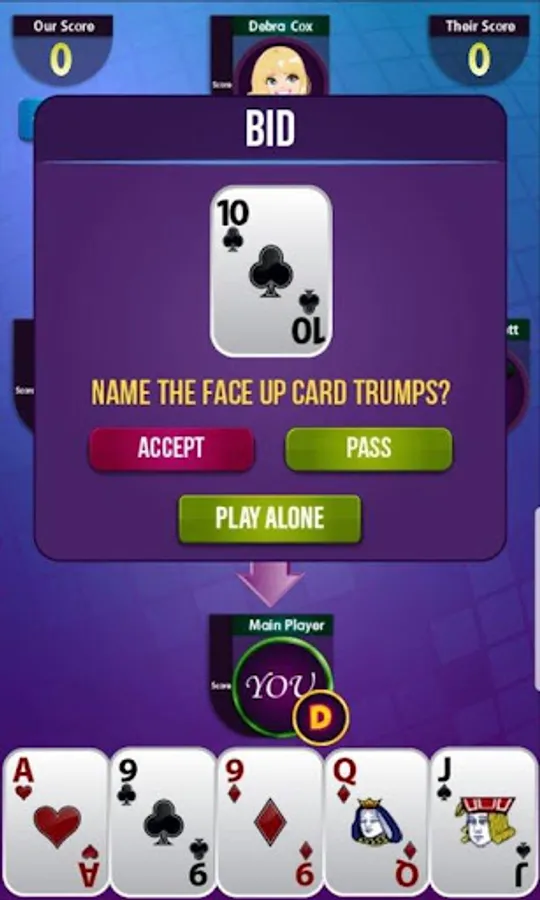 In Euchre Free, a classic card games, you play just like in real life with addict Euchre players, choosing between accepting the trump, passing or changing your cards, playing the match with your partner or going alone. Play the best cards and use the trumps wisely to win the tricks.