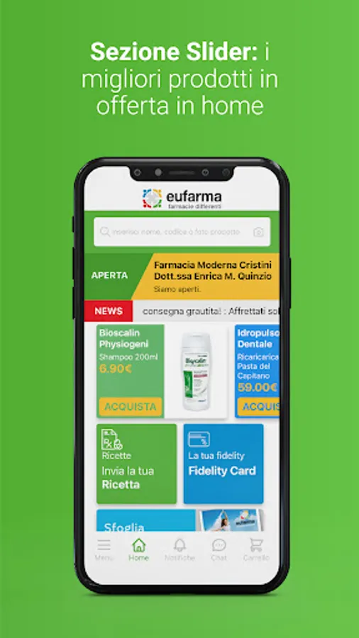 - You will be able to become part of our exclusive loyalty circuit: by purchasing in the app, you will accumulate points to be used to request exclusive rewards. Furthermore, in the fidelity card section, you will always have your points balance at hand and you can choose your rewards, request them directly in the app and collect them at the pharmacy.