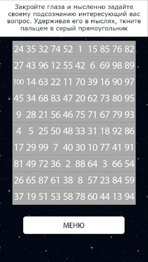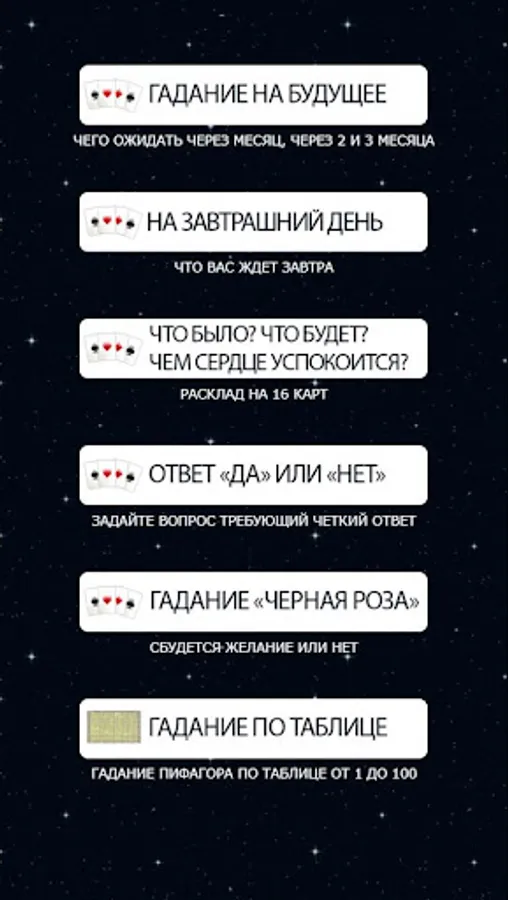 In our application, you are waiting for fortune-telling on cards Yes or No, predictions for every day, as well as fortune-telling from a table from 1 to 100, and gypsy fortune-telling for love online and for free.