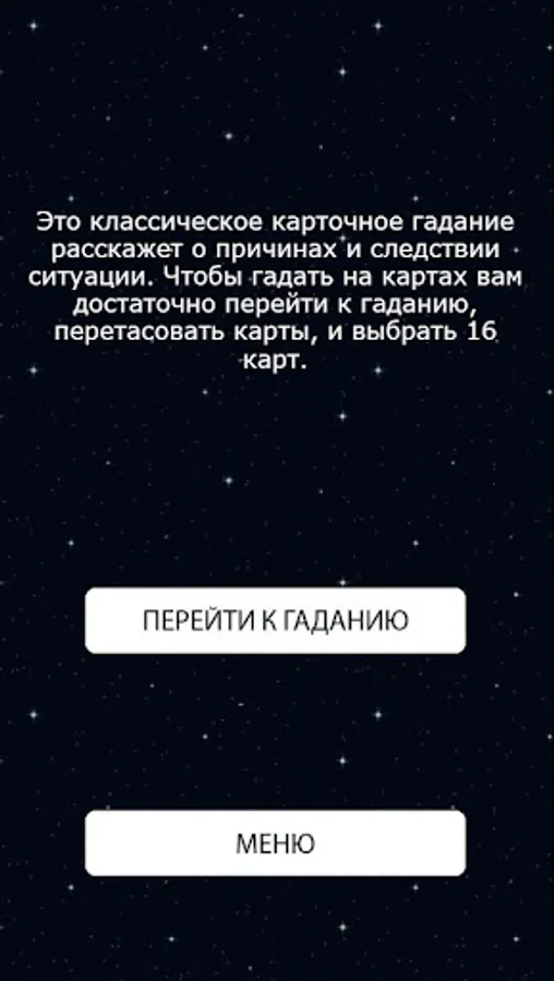 Any prediction, to be true, requires concentration on the question posed to the cards. Any fortuneteller (if she is really guessing), in the process of shuffling the cards, invites you to concentrate on what you want to get predictions about. Therefore, you need to do the same using the app.