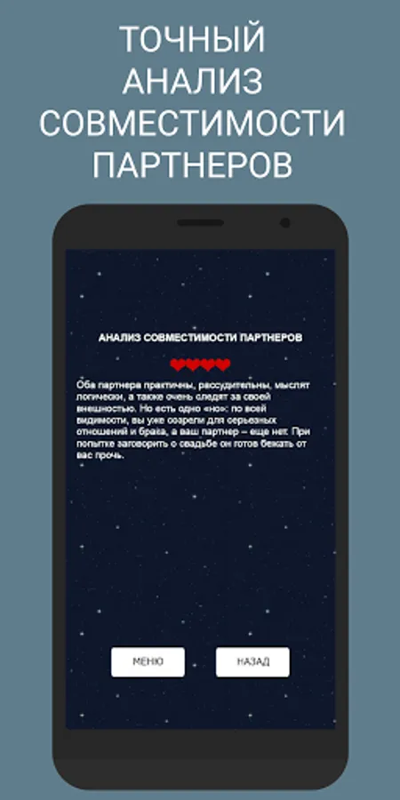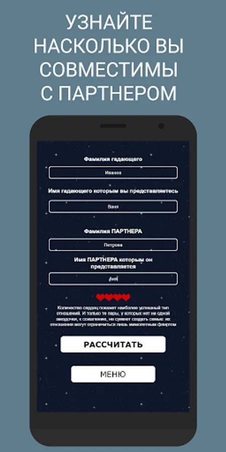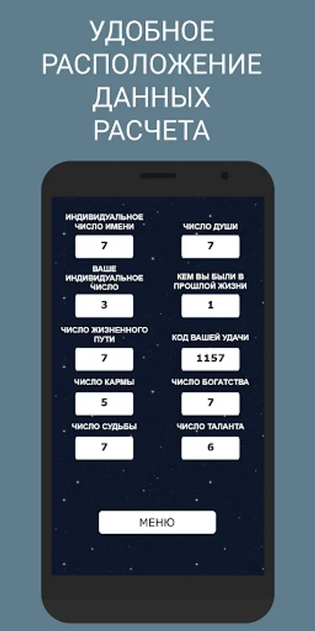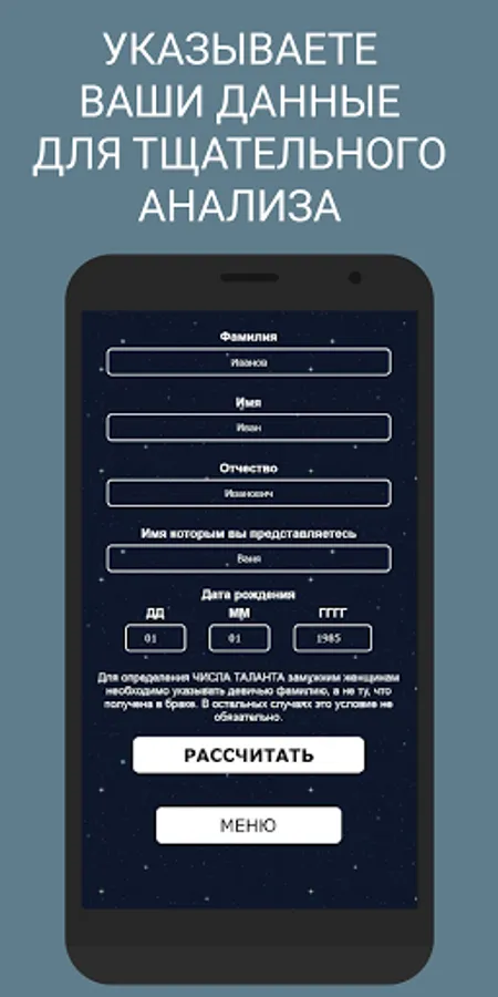 Numerology uses your birthday numbers and your name to display the complete numerology horoscope. The complete numerological horoscope will allow you to find out your Individual Number of Name, the number of Destiny, Soul, Personality, as well as who you were in a past life and what you did. Having calculated the horoscope for every day, it will allow you to avoid mistakes, or, on the contrary, achieve success where you would not even think to achieve success. In addition to the horoscope for every day, in our application you can calculate the compatibility horoscope of partners, which distinguishes our application from others, with a high accuracy in predicting the likelihood of developing relationships between partners, as well as your personal talent number, indicating the activity in which you will be successful.