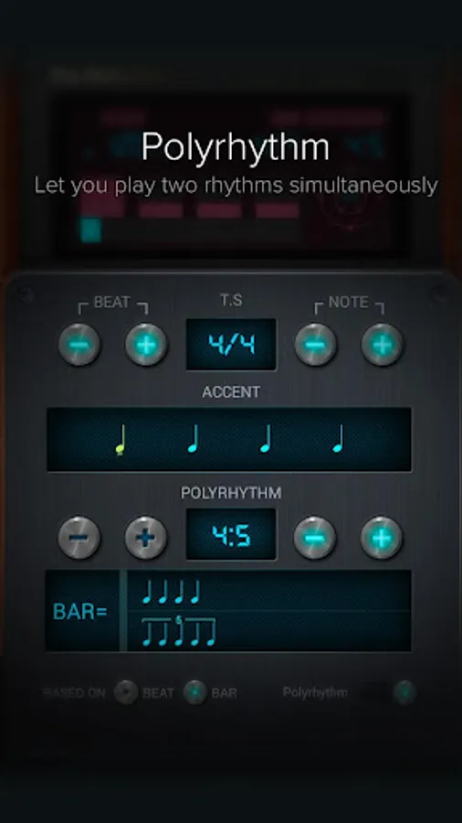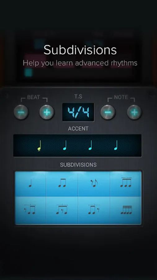 Pro Metronome is all about customization – change beat sounds, accents, and even choose from 4 different beat volume levels ("f", "mf", "p" and "mute.") With the Pro Version, access subdivisions, polyrhythm settings, and create complex patterns with triplets, dotted notes, and non-standard time signatures.