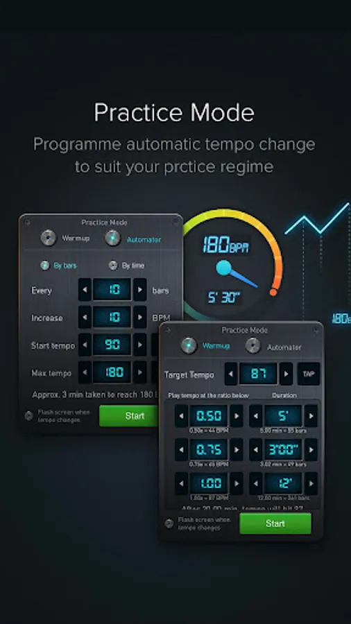 +Practice Mode – allows you to programme automatic tempo change to suit your practice regime.
