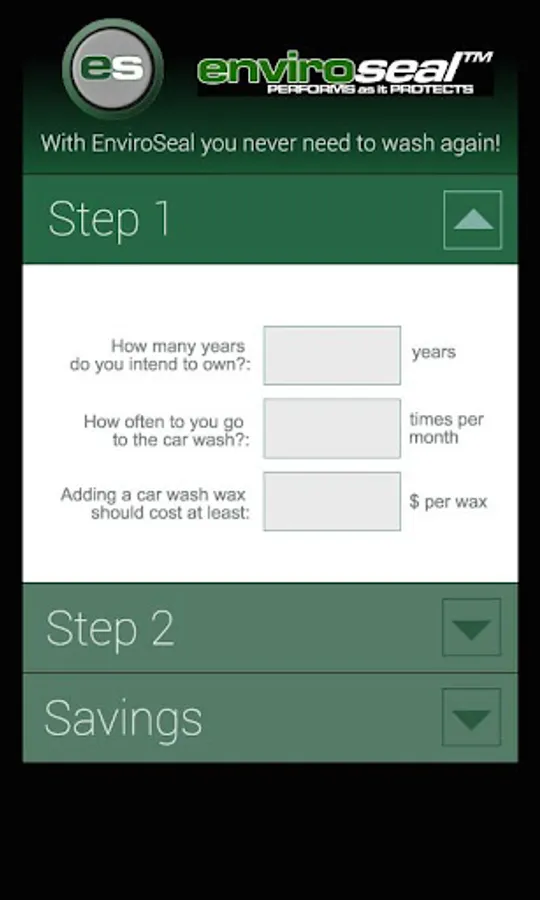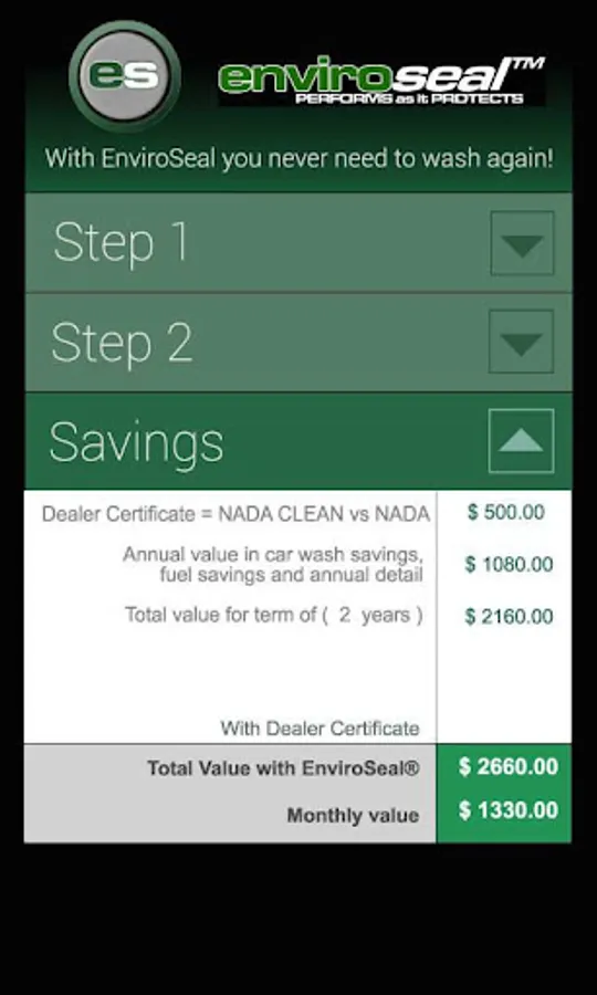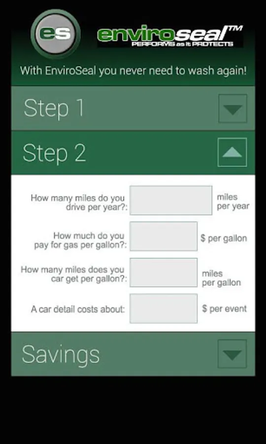 EnviroSeal is an app to assist in assessing the benefits of using the EnviroSeal™ auto protection and enhancement product. The app highlights benefits while calculating the savings and additional value it provides automobile owners.