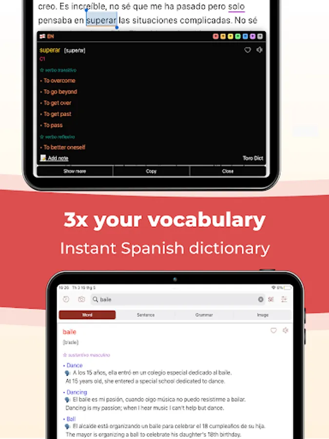 - Look up quickly with an offline translation box (detailed Spanish grammar, pronunciation, examples, and illustrations)