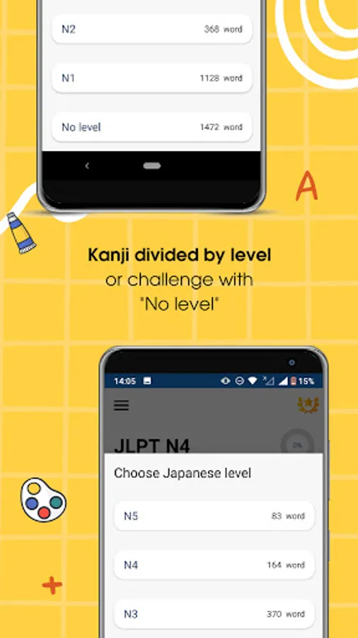 - Kanji divided by levels from N1 - N5 or challenging with no level division