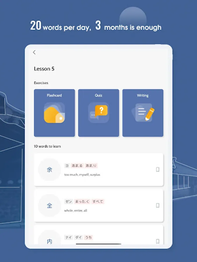 Don’t worry. Janki will help you learn Japanese Kanji with all 4 skills: listening - speaking - reading - writing with convenient features and smart learning route!
