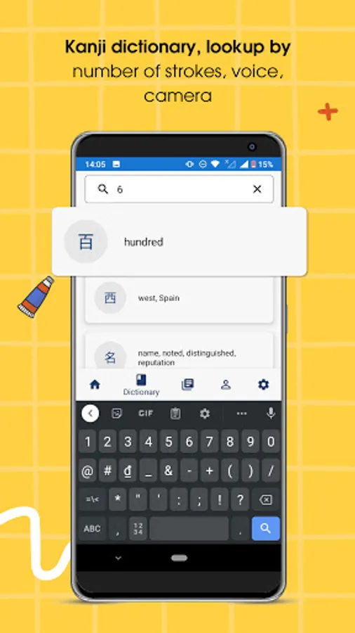 - Kanji dictionary: camera, voice, handwritten, typing, searching by radicals