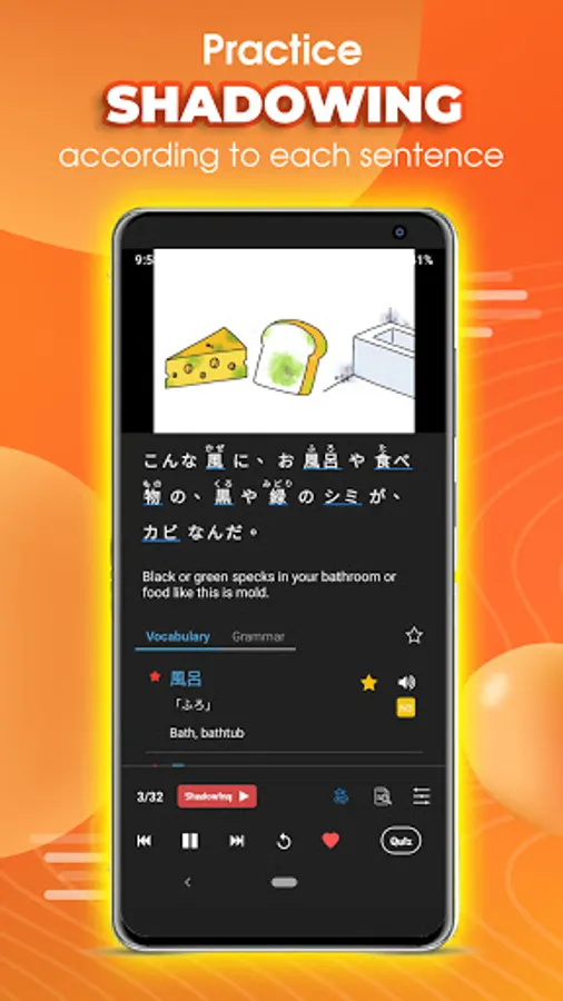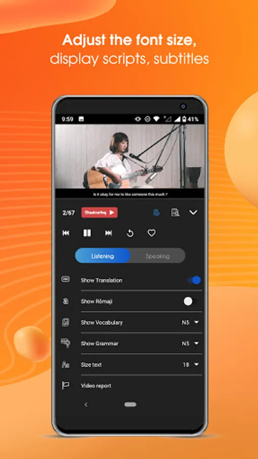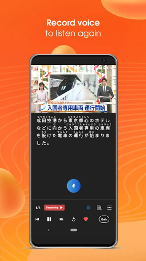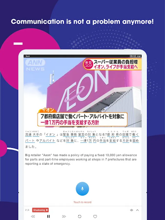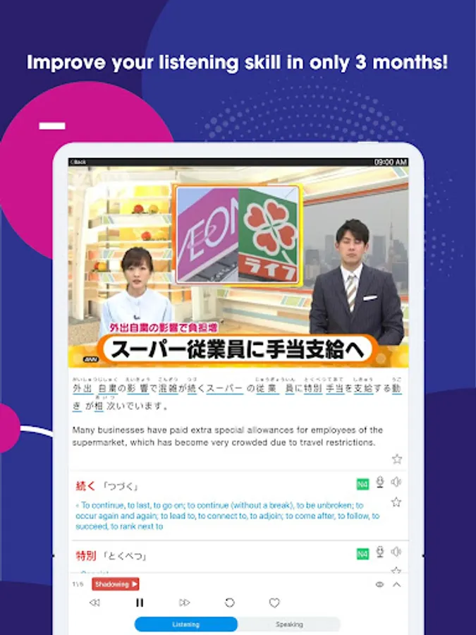 - Listen and speak Japanese, English, Chinese with shadowing, voice record, subtitles, game