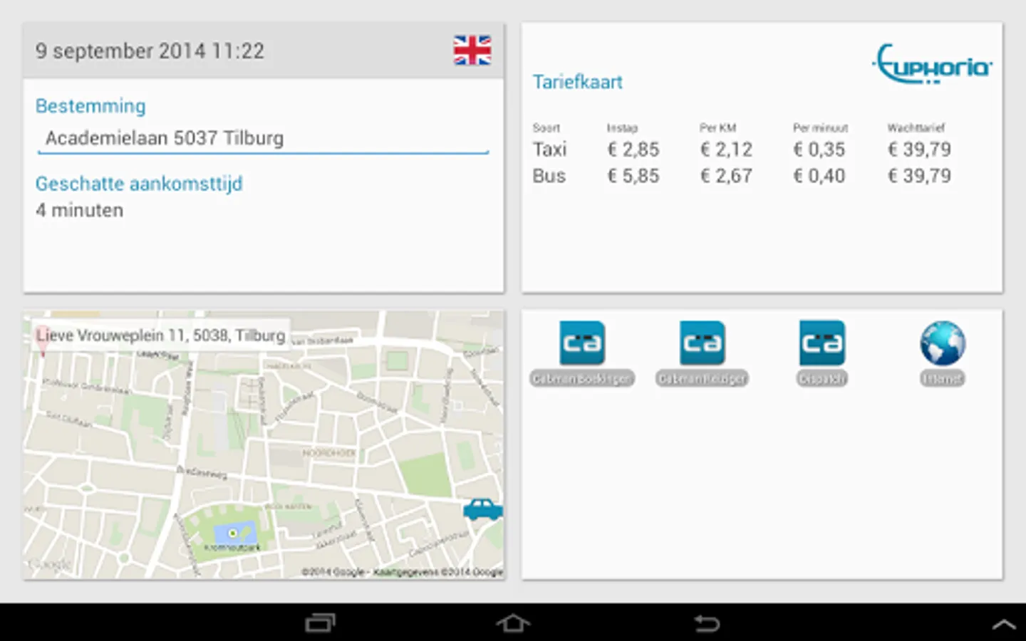 The purpose of the app is to offer passengers during their ride a protected environment on a tablet, which the app as the home screen of the device functions. Inside this home screen identified a number of components that the passenger can immediately see and use. So the passenger can see trip information, a rate, its destination and location on the map and it can be a number of pre-use apps found within this environment. The app shows during the ride include also the estimated time of arrival if a destination is entered. During use of the app the passenger is limited in the use of the underlying system Android.