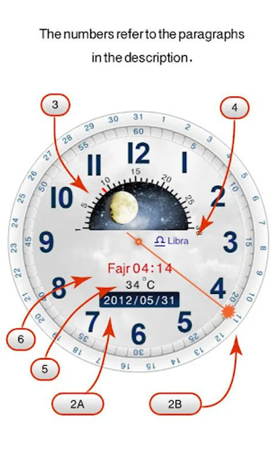 A- The Digital Calendar (see fig.): in a frame locate lower part of the clock disc, you can choose for it to show either day of the week, or the date according to Gregorian, solar Hijri, or lunar Hirjri calendars.