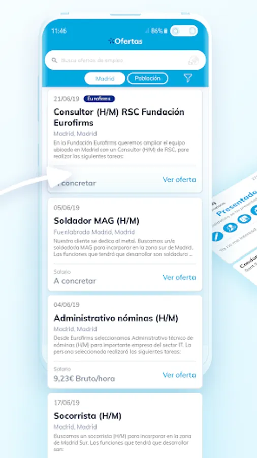 Search and find work with the Eurofirms APP. Apply in less than a second to the offers in your area, follow the status of your applications, manage your recruitment and complete all your personal data in one place.