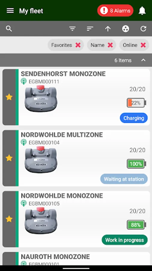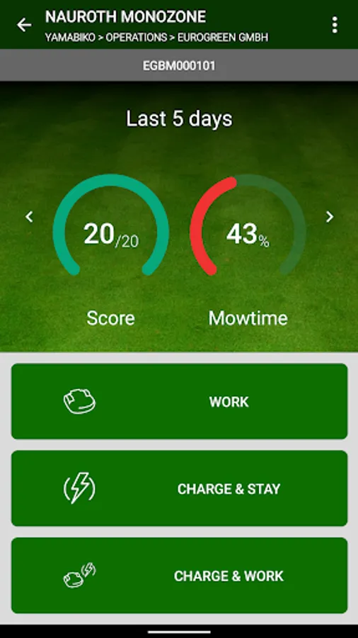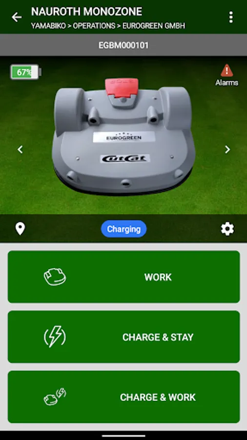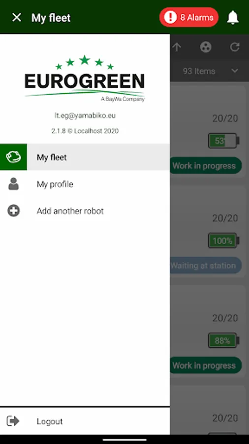 The Eurogreen app gives you control to your robot, wherever you are. Check live status, battery level and performance of the last five days. Get easy overview of activities, parameters and schedule. Send any commands and get instant confirmation. Check robot GPS Location with associated alarms position. Search, sort, filter and group to compare robots.