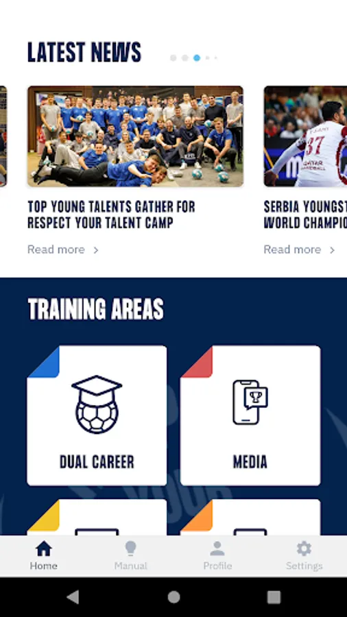 The app. As part of the programme, the Respect Your Talent app represents a digital space for self-development. Our interactive platform helps aspiring handball players improve their knowledge and build skills alongside the game of handball. The manifold resources of the App assist to better cope with the current challenges of competitive youth handball, as well as to proactively prepare for the future demands of professional handball. A steadily growing collection of micro trainings covers areas such as Media, Mental Fitness, Dual Career, Sports Law, or Anti-Doping. Tailored to the needs of young athletes, our compact training sessions were co-created by current and former stars of the game, together with international disciplinary experts.