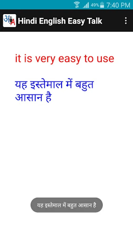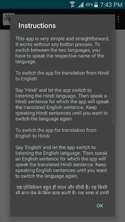 Can also be used as a voice dictionary between English and Hindi. (Just speak the word you are looking in the dictionary).