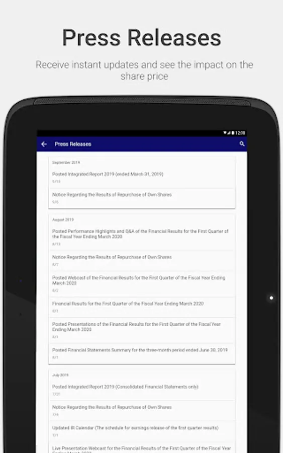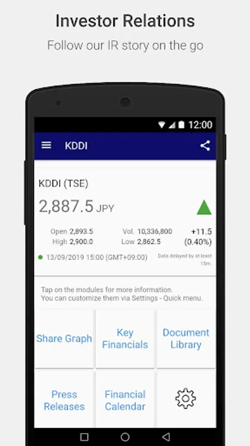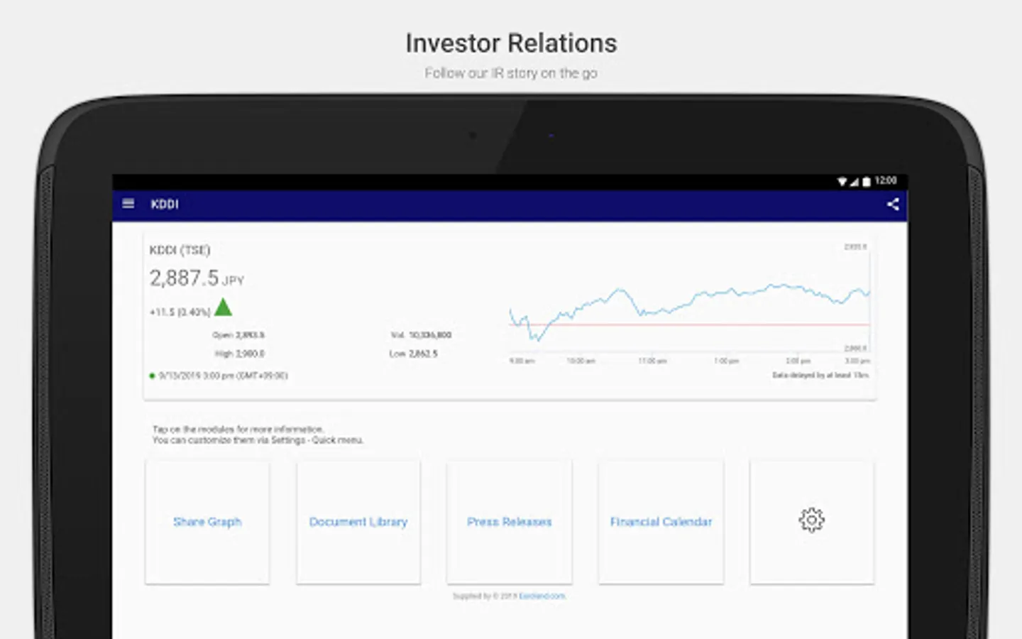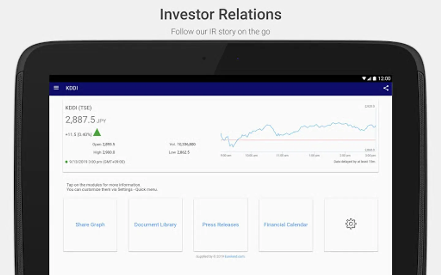 The KDDI Investor Relations app will keep you up-to-date with the latest share price data, stock exchange and press releases, IR calendar events and much more.