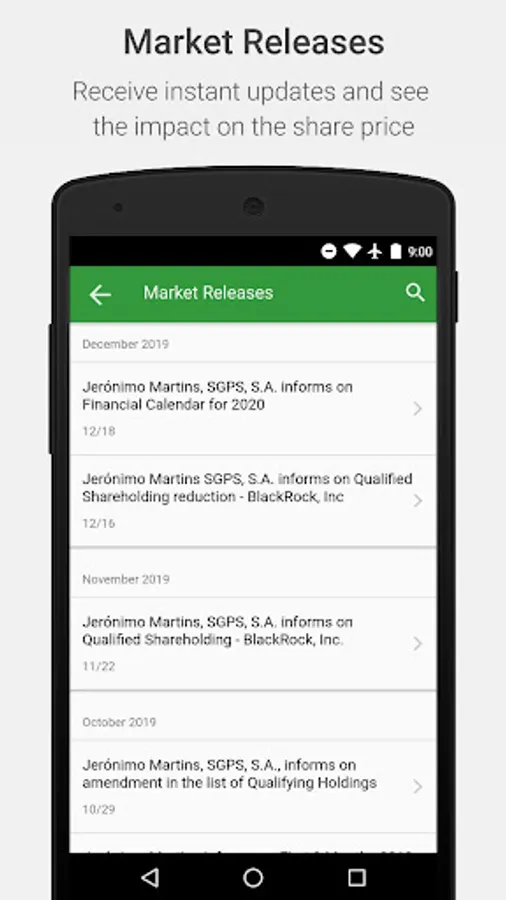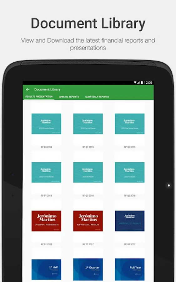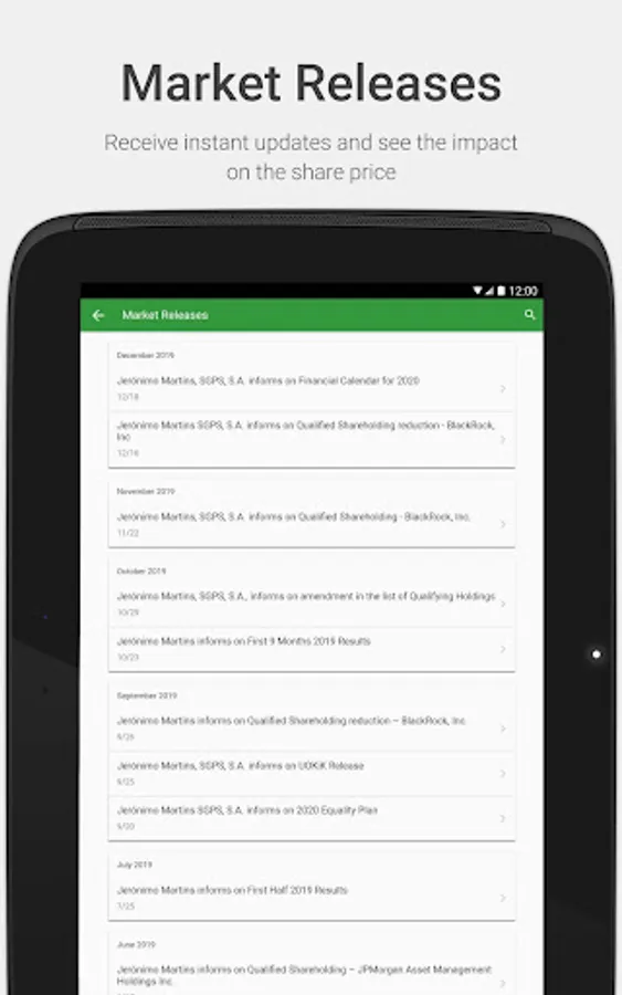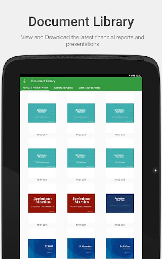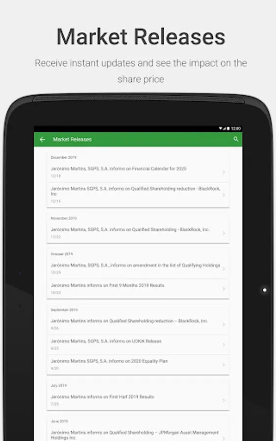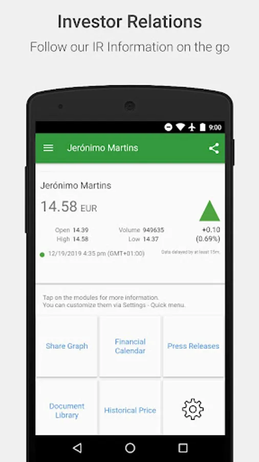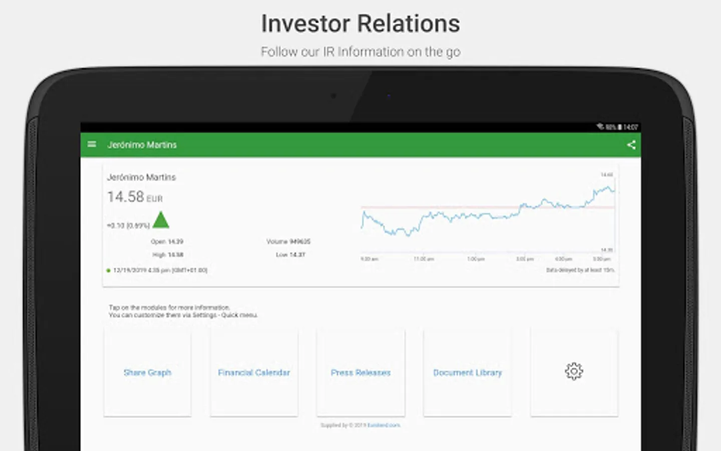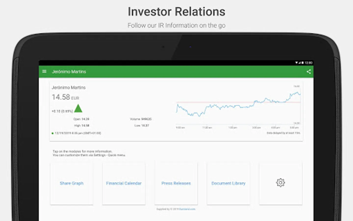 The Jerónimo Martins Investor & Media Relations App will keep you up-to-date with the latest share price data, stock exchange and market releases, IR calendar events and much more.