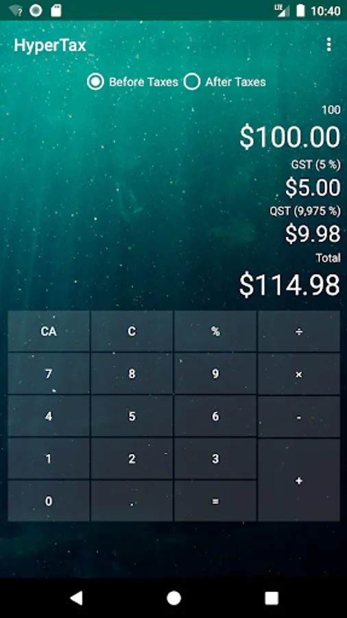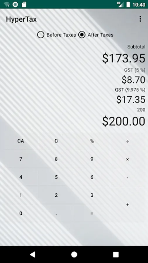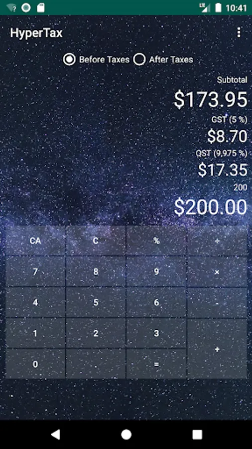 HyperTax is fast, simple and beautiful! It's more than a simple Canadian sale taxes calculator, it's a fully functional calculator! Ever wanted to know the real cost of an item, even when it has a rebate? Simply punch it in the app and know what it will cost you! And why not do it in style? Choose from the included background! Calculating taxes will be as fun as it can be with HyperTax!