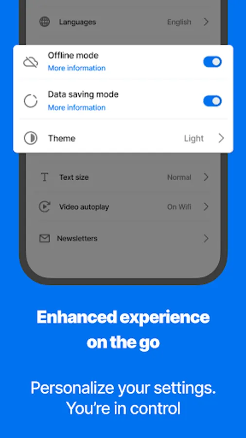 β’ The data savings feature: choose if you want pictures, enriched stories or simply a text raw version