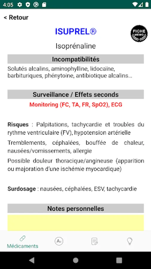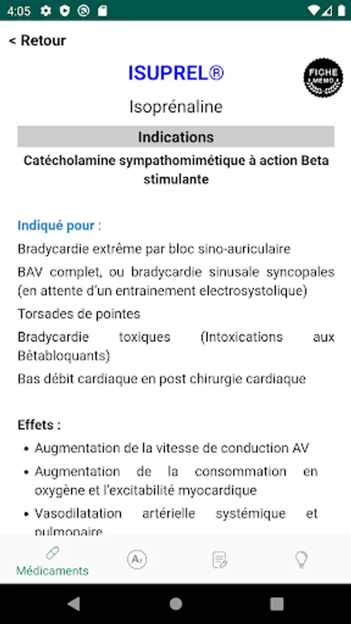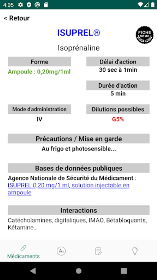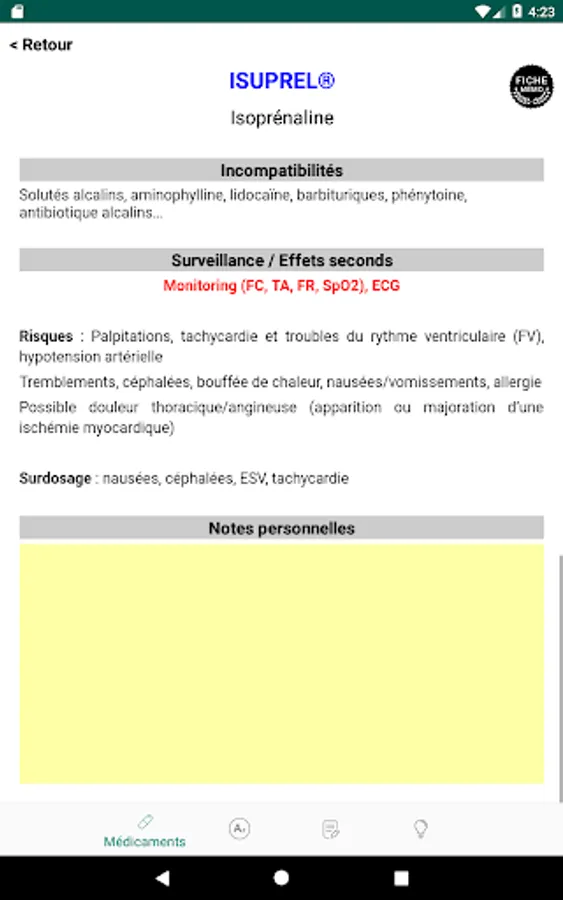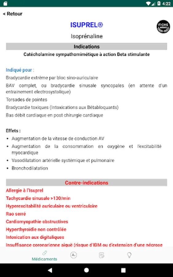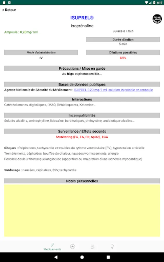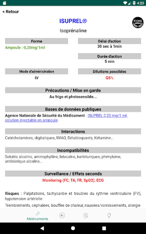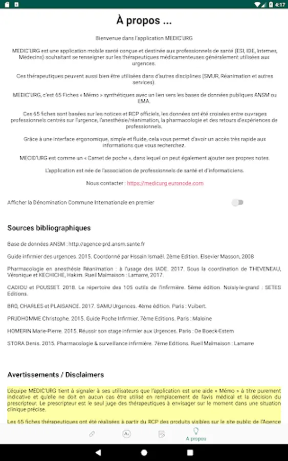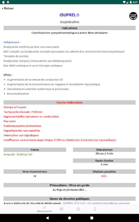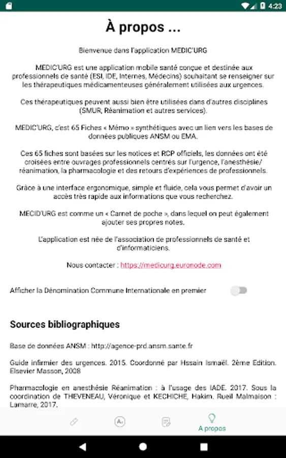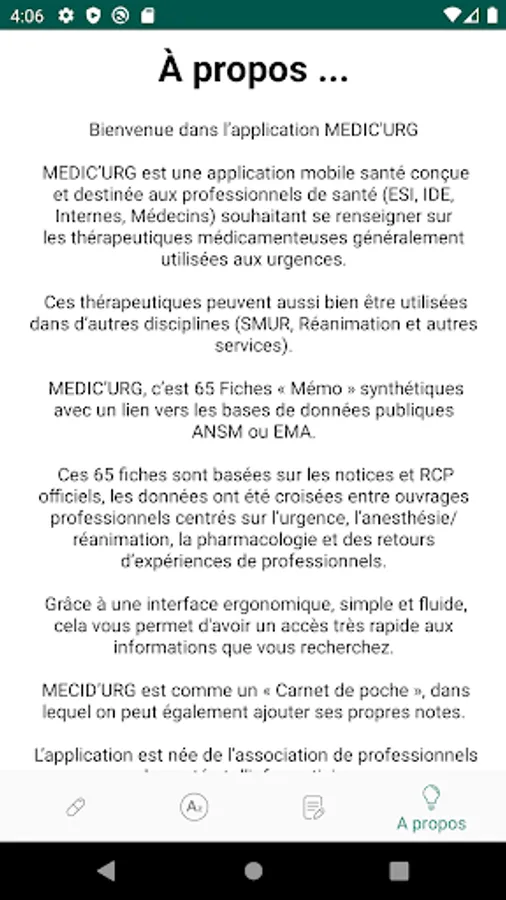 MEDIC’URG is a mobile health application designed and intended for health professionals (ESI, IDE, Internal, Doctors) wishing to learn about the medicinal therapies generally used in emergencies.