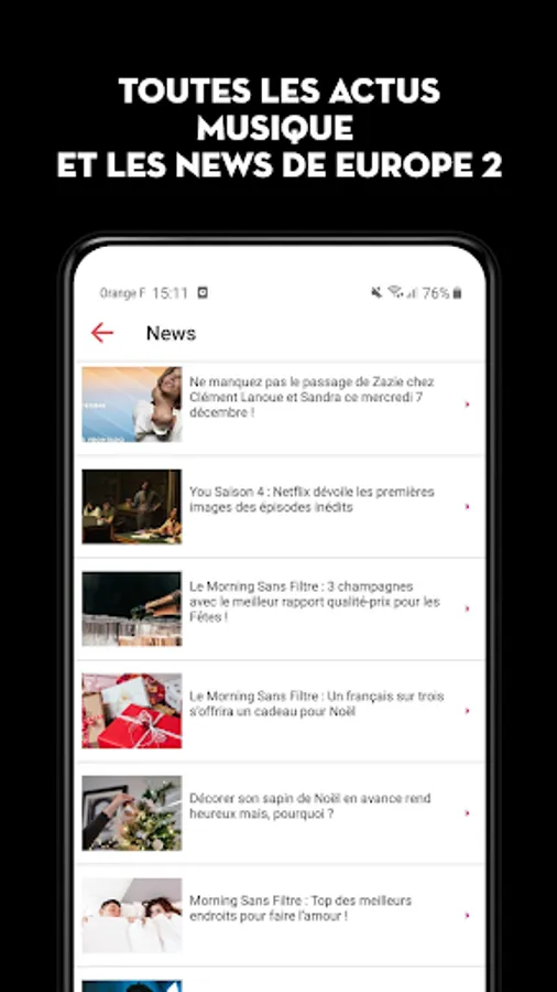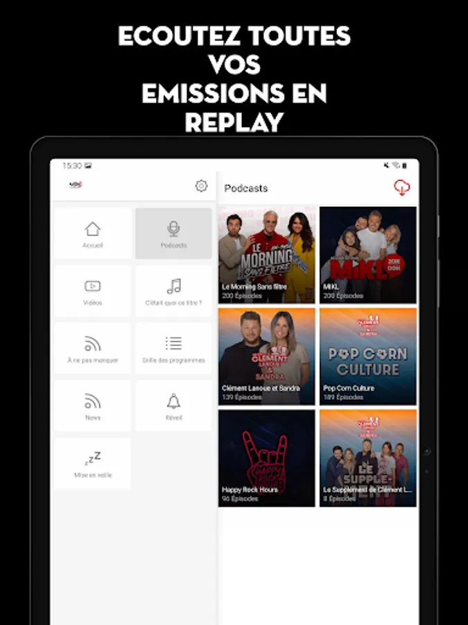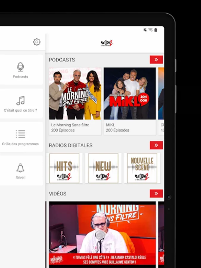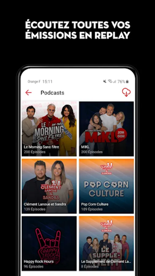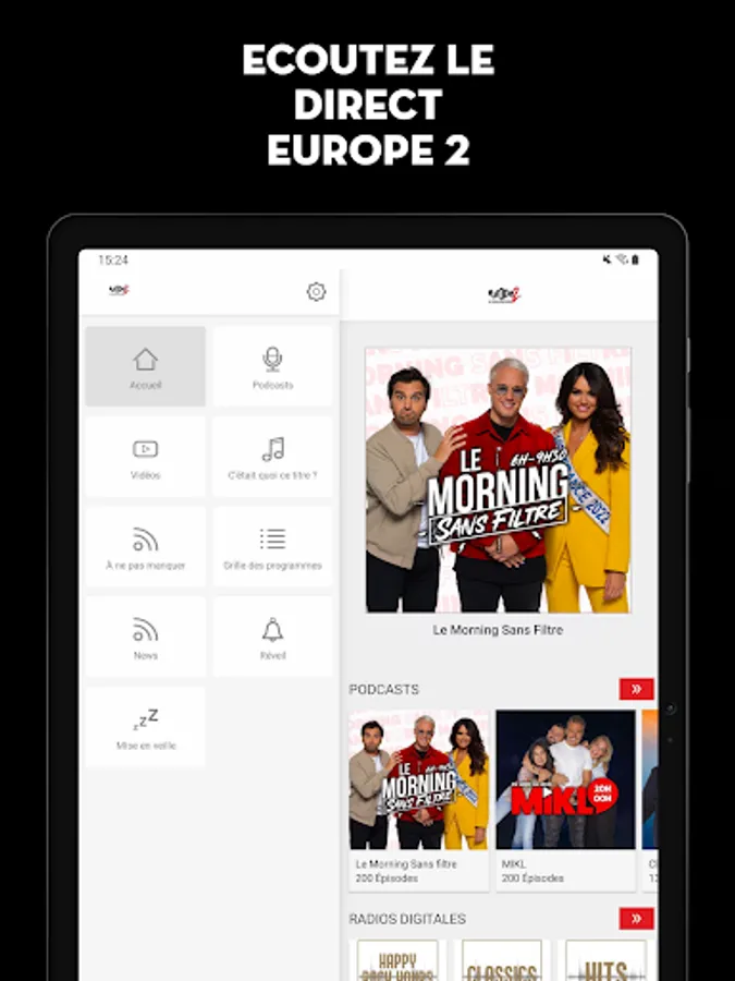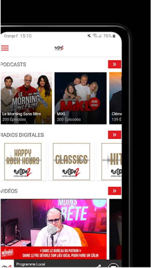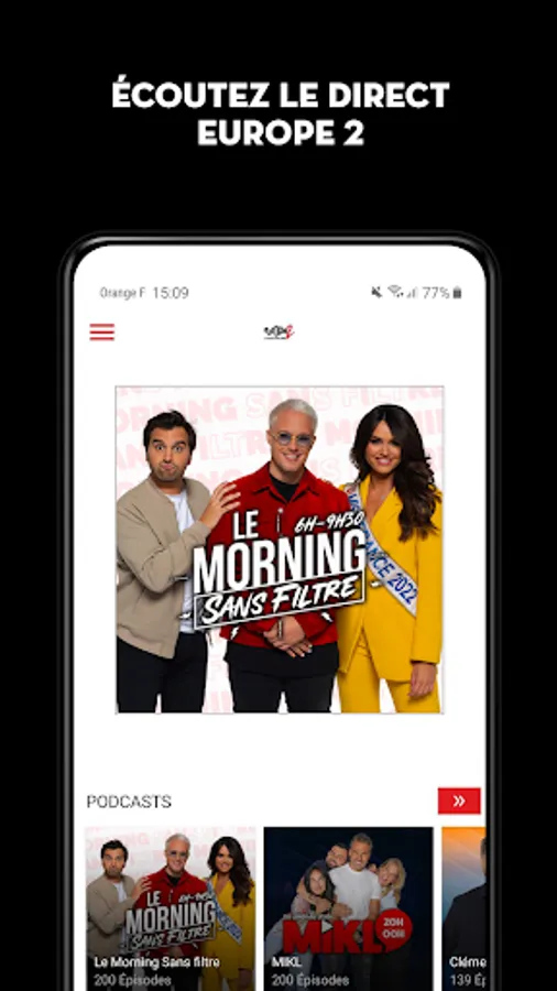 Podcasts of your favorite shows: Morning Without Filter by Guillaume Genton, Diane Leyre and Fabien Delettres, Clément Lanoue and Sandra, Europe 2 Lab, Happy Rock Hours with MIKL…