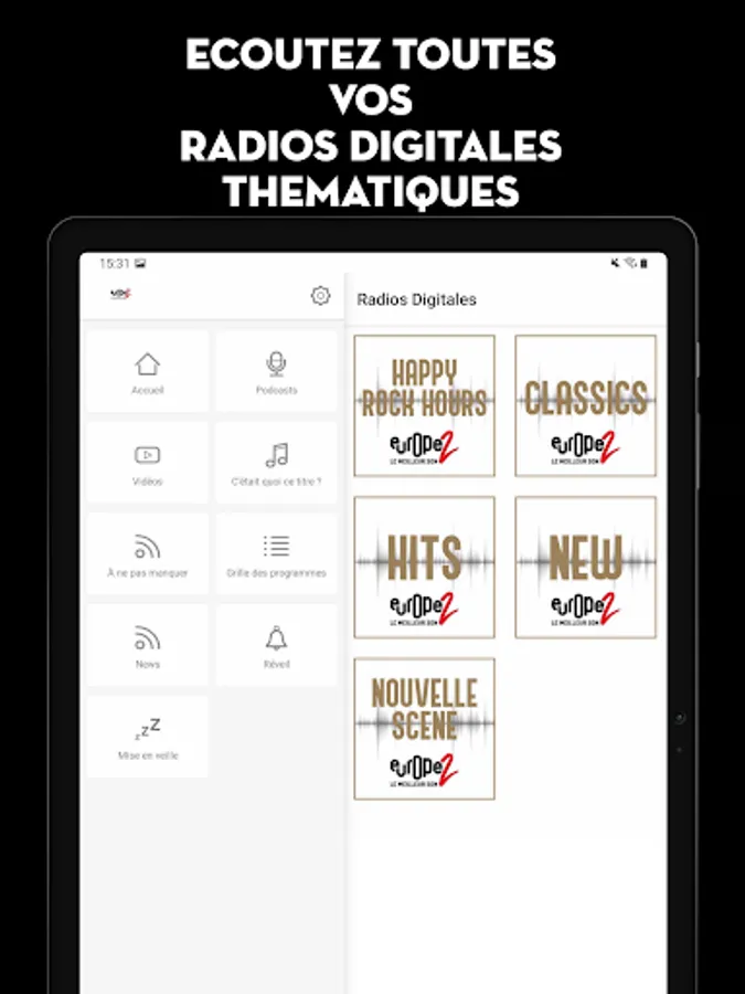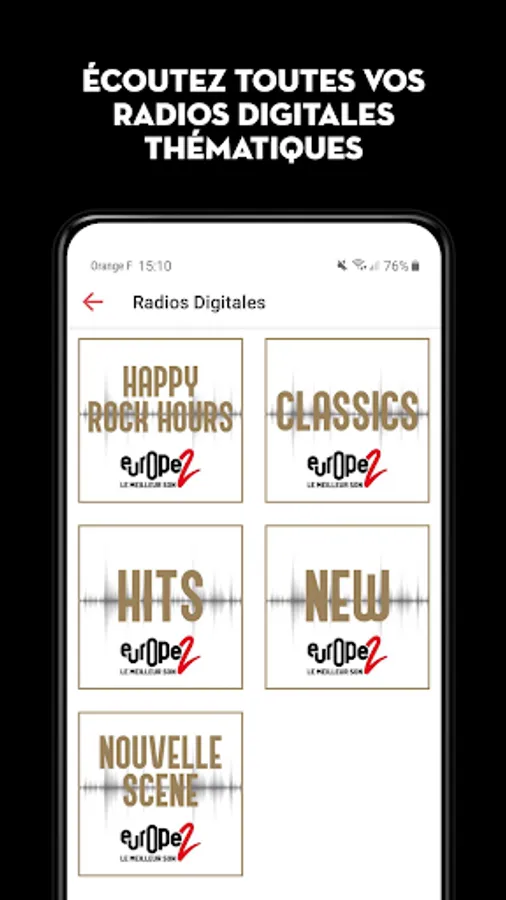 Europe 2 themed digital radio stations: New, Hits, Nouvelle Scène, Classics, Happy Rock Hours, etc.