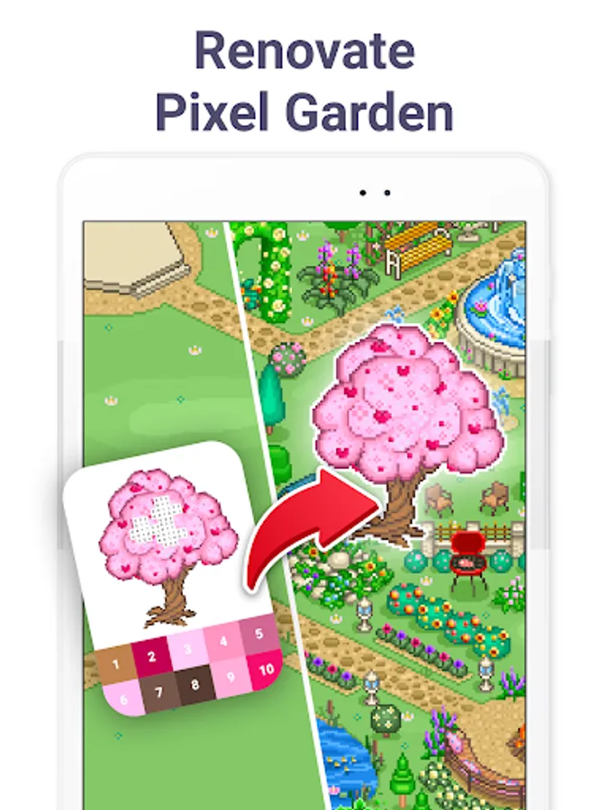 ✔ Meet a brand new feature - Flower Garden! Color unique objects, build your own garden and get rewards. Dive into a new meta world inside Pixel Art coloring book!