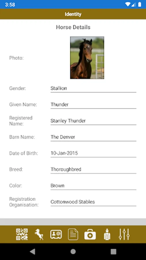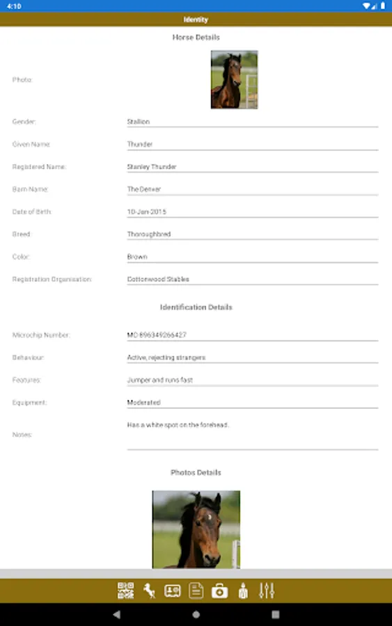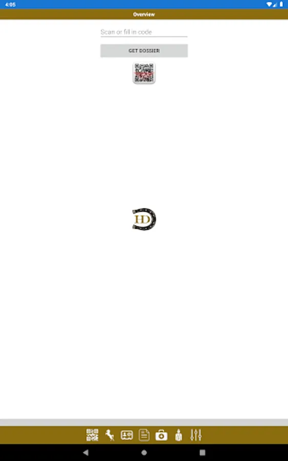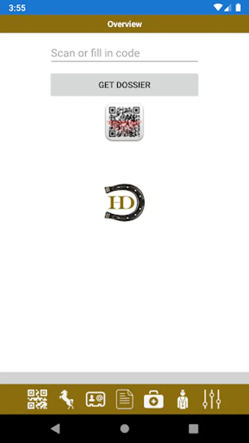 A horse dossier is identified using an Identification code generated by Horse Identity portal and is assigned to each horse profile using Horse-ID app. Filling the Identification code or scanning its qr-code allows an authorized Horse Medic app to retrieve the horse dossier.