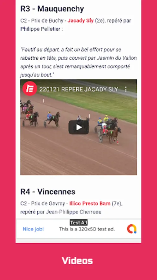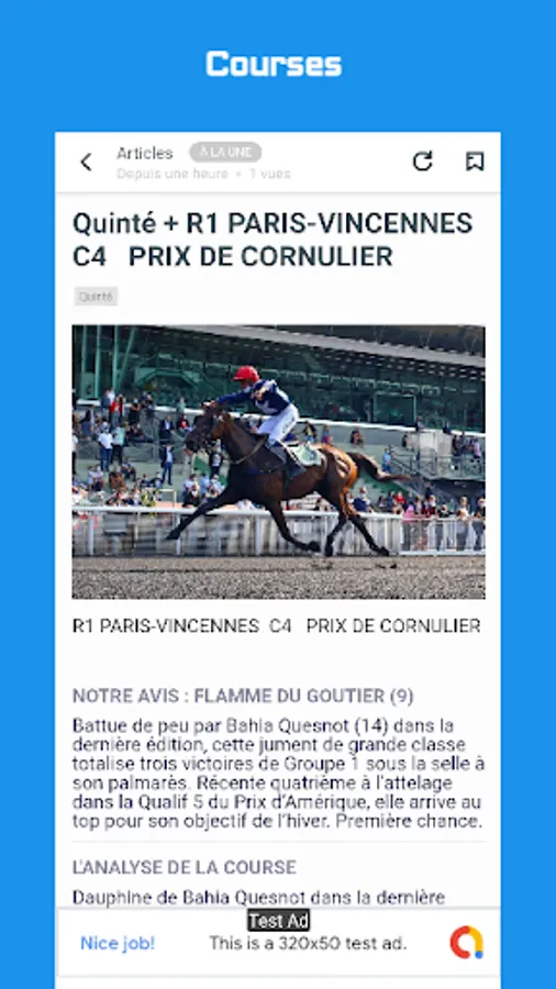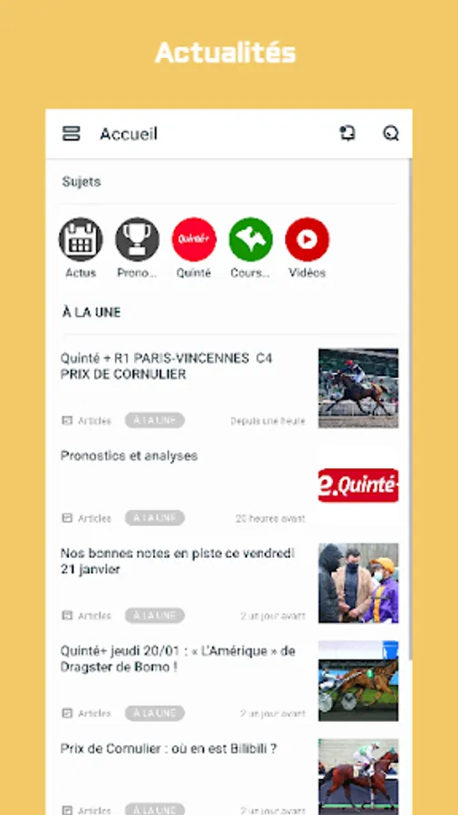 Take advantage of the best horse information for all pmu races in France and abroad. Predictions for all races, an exhaustive presentation of the Quinté, the pmu race program, results and reports, horse racing news, complete statistics on the horses' past performances. Sections such as: Côté pistes, Côté punters, Côté pros and exclusive analyzes by consultants.