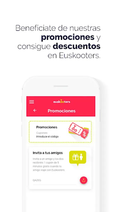 · Promotions: Discount codes, invite a friend… Redeem in this section all your coupons to enjoy discounts on Euskooters.