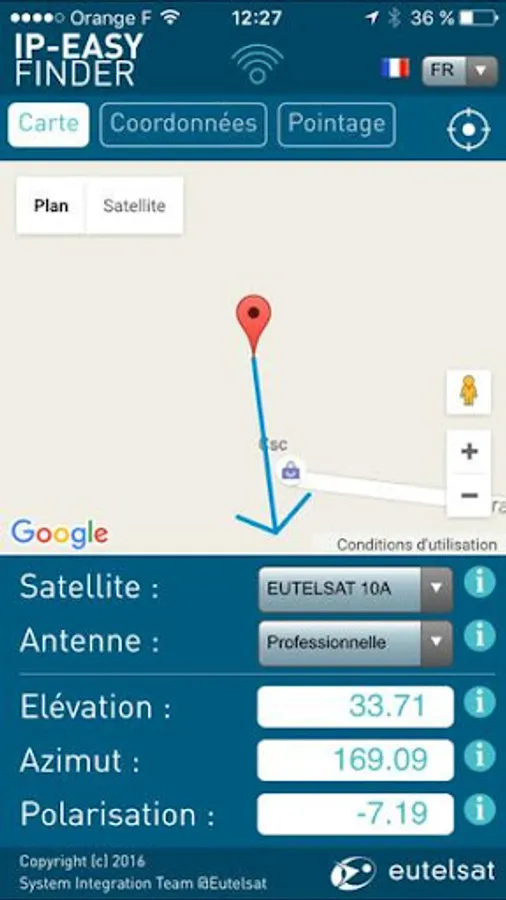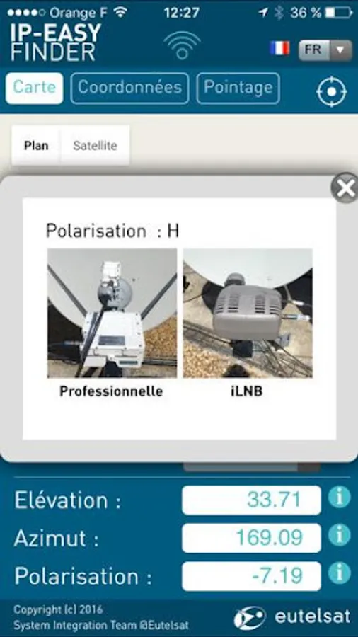 It determines the scoring parameters for each of the 4 satellites available for IP-Easy service Eutelsat. IP-Easy Finder indicates, depending on the geographical location, the value of the polarization angles of elevation and polarization.