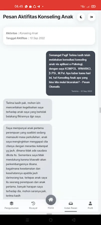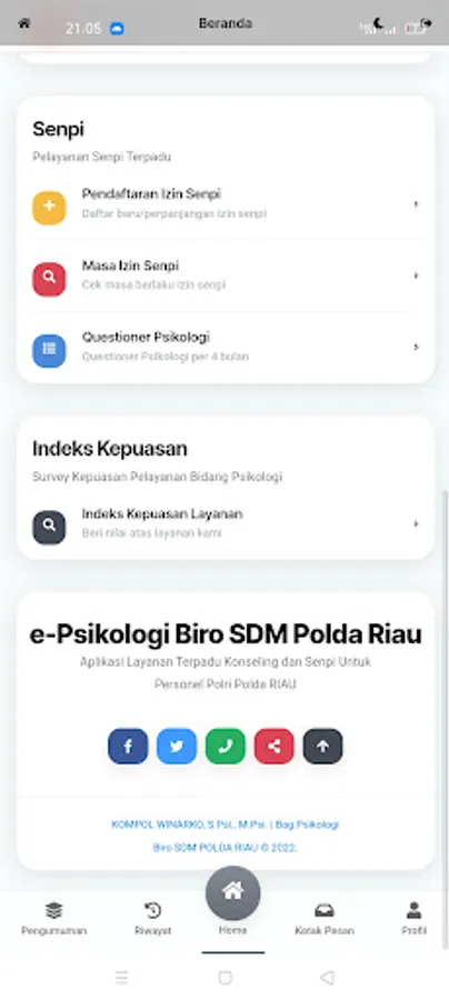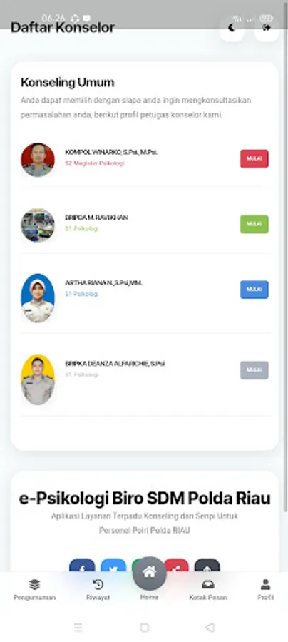 E-PSYCHOLOGY was introduced by Mr. Kompol. Winarko, S. Psi., M. Psi. as a media for counseling services and information borrowing and using Senpi in the Riau Police environment. This application can be accessed online within 24 hours / day.