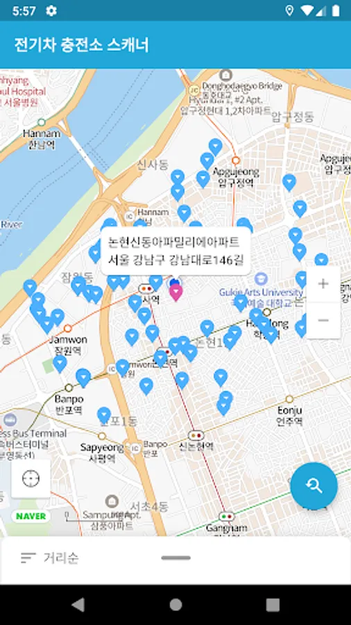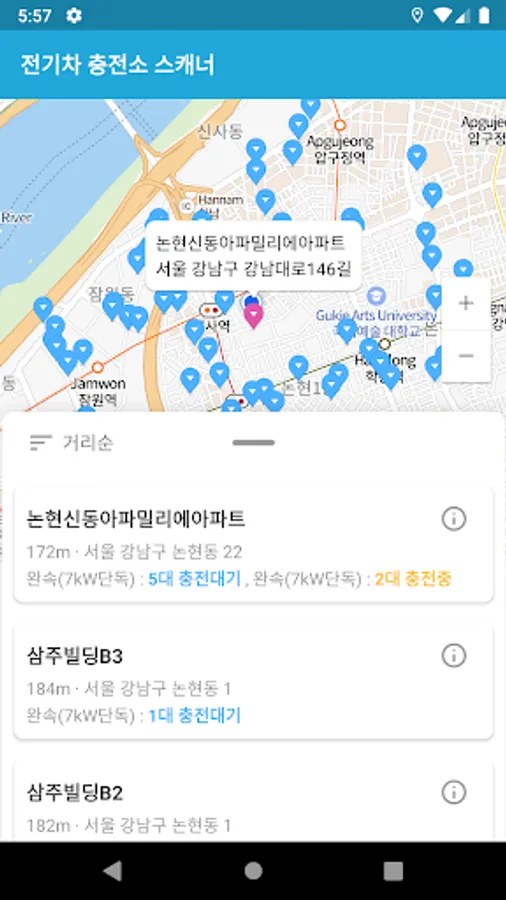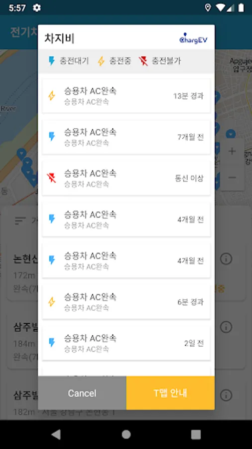 You can check the location and distance of the charging station on the map, and you can check the name, address, charger type, and charging status of the charging station on the list.