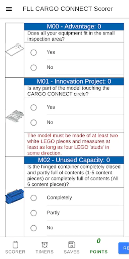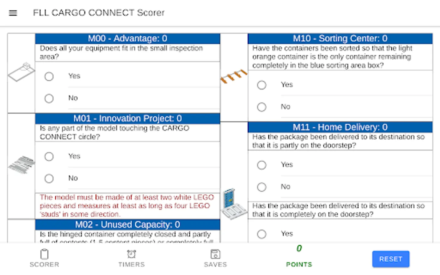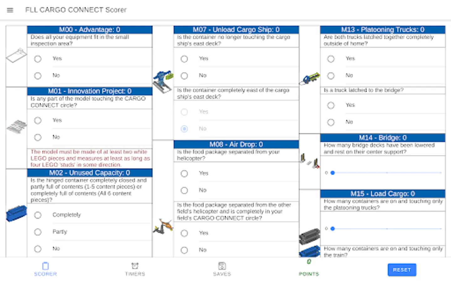 The scorer features a built-in advanced error checking system to prevent you from incorrectly scoring your missions. The scorer is kept up-to-date to reflect any rule updates to the CARGO CONNECT robot game. You can save the scores and view your progress.