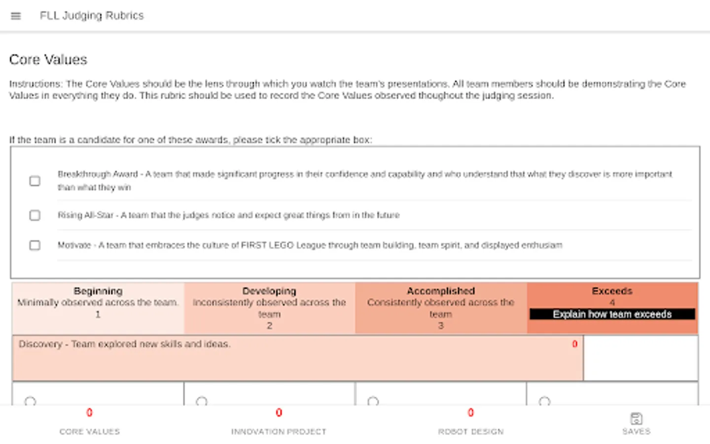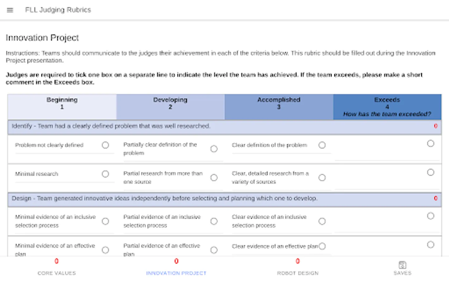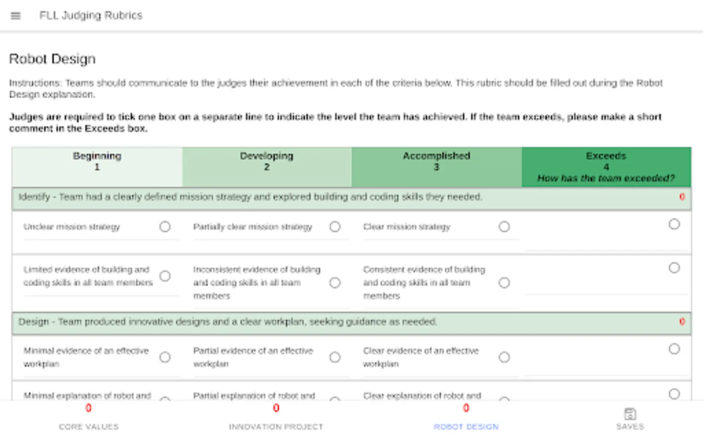 The rubrics help you self-evaluate your team's performance in Robot Design, Innovation Project, and Core Values periodically throughout the season. You can score yourself on digital rubrics and save the scores. You can later re-load the rubric to track your performance. The FLL Explore Reviewing Sheet functions similarly.