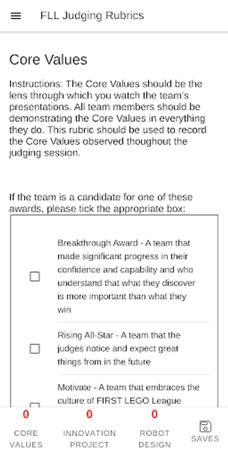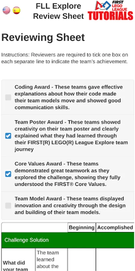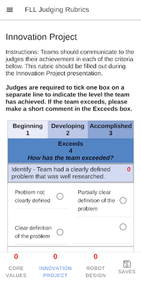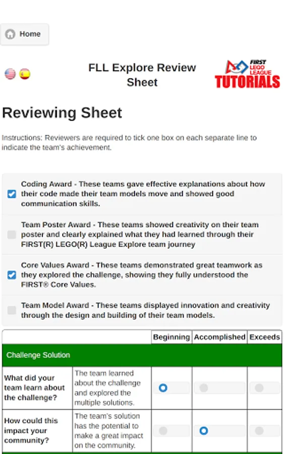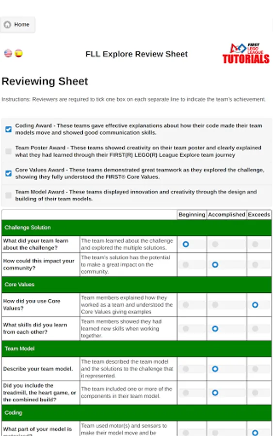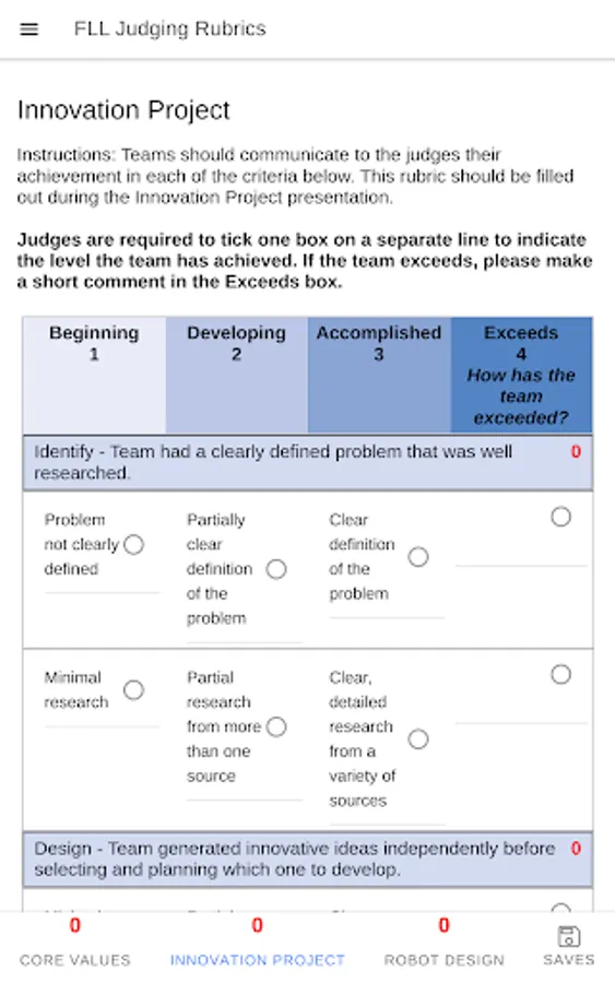 The rubrics help you self-evaluate your team's performance in Robot Design, Innovation Project, and Core Values periodically throughout the season. You can score yourself on digital rubrics and save the scores. You can later re-load the rubric to track your performance. The FLL Explore Reviewing Sheet functions similarly.