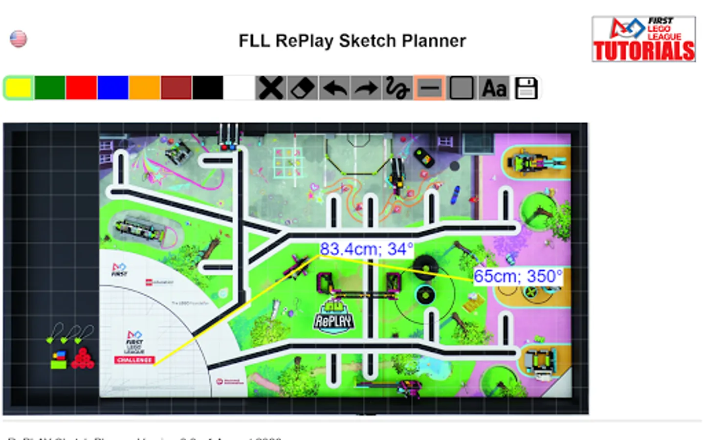 Use the FLL RePLAY Sketch Planner to plan your robot runs. You can draw your path across a virtual FLL table where you want your robot to drive. This tool comes with the ability to save your drawing, so you can try different plans before you come up with a final plan. The line tool comes with built-in distance and angle measurement to help program your robot.