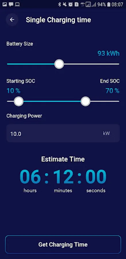 In Single Charging Time, enter the value of your Battery size, your Current Percentage and your desired Power percentage.