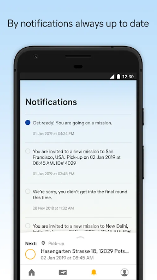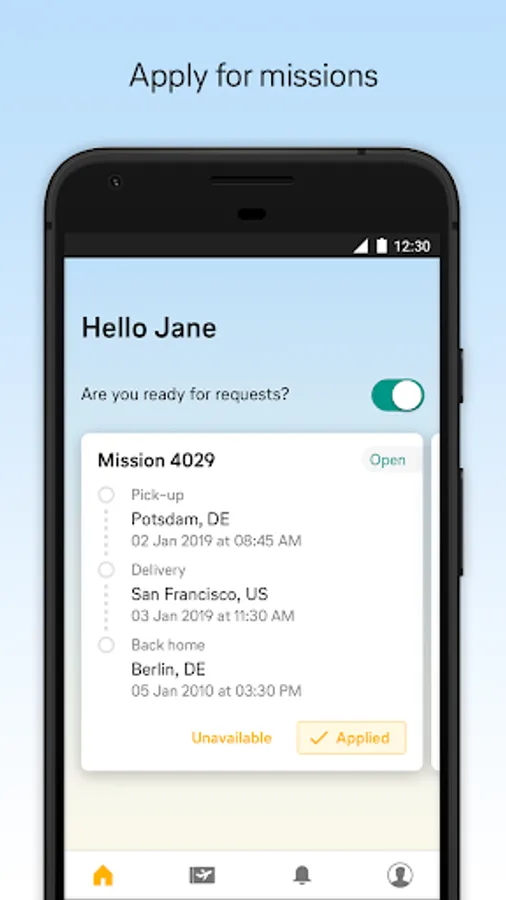 Manage your airmates On Board Courier missions everywhere and at any time! Tell us your availability status, receive push notifications when a new mission is opened and apply or decline directly from within the app.