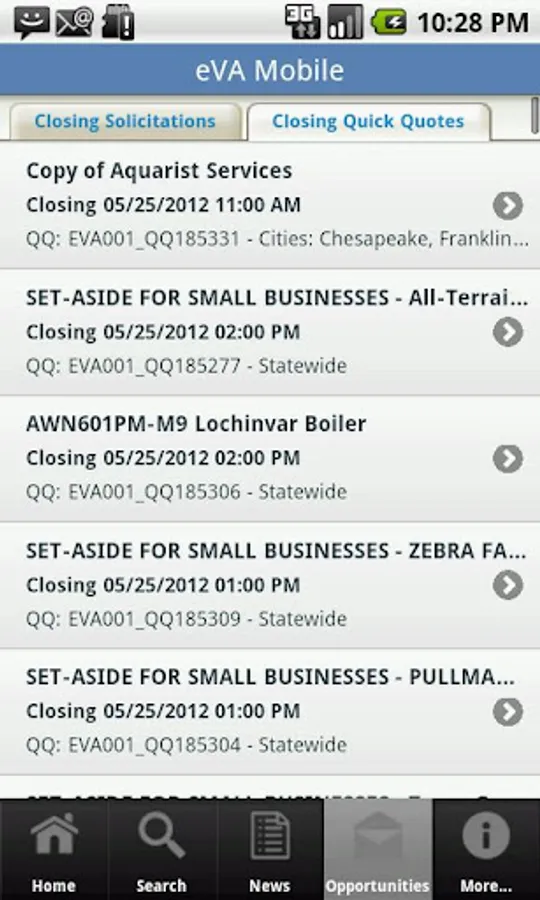The official eVA Mobile app provides users real-time access to business opportunities with Commonwealth of Virginia state agencies, universities, colleges, local governments and other Virginia public bodies.