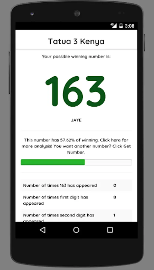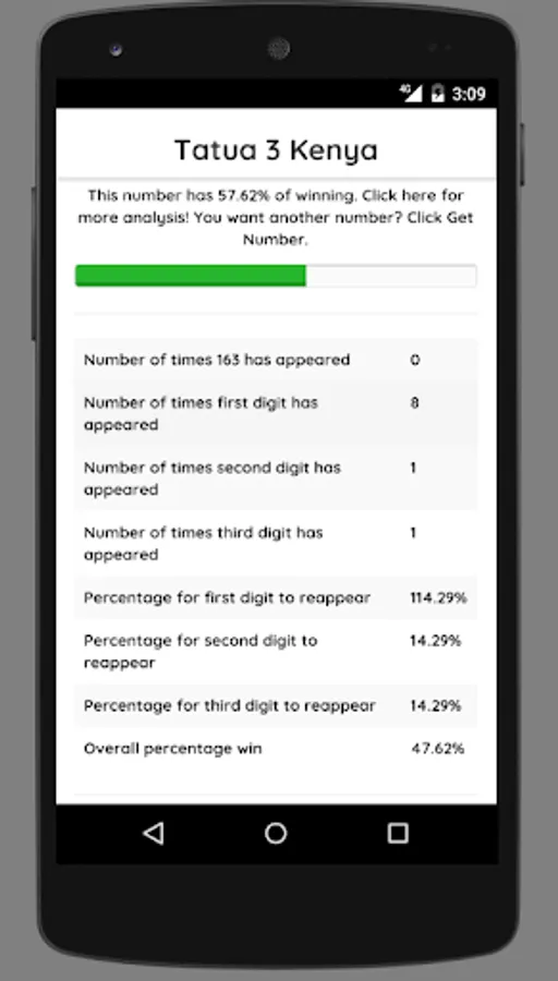 Tatua 3 Kenya Mobile application is one of its kind. After a long time of researching and analysis Tatua 3 Team is happy to present to you a mobile application that will provide you with numbers and some analytics based on the previous games played by the Tatua3 draws. Itsa simple and free method of getting analytics for free!.