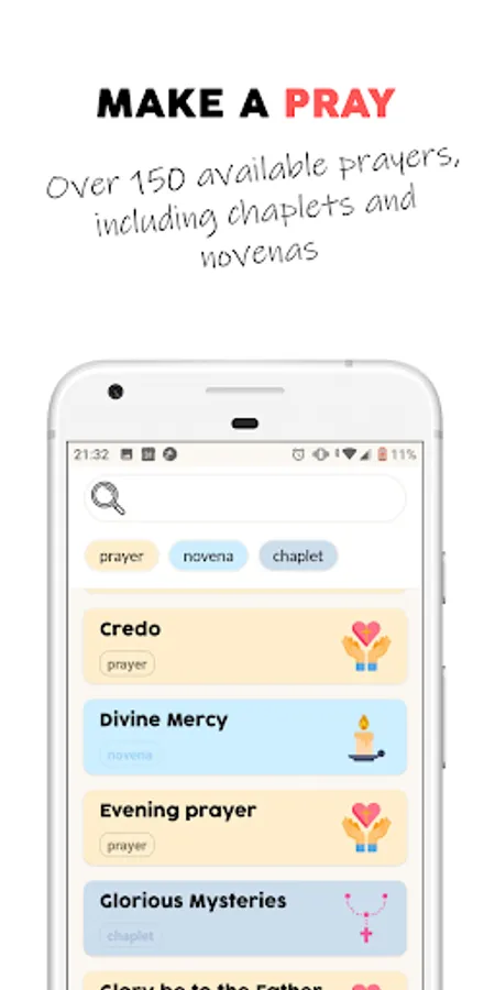Make a prayer. Meditate on the rosary. Pray a novena. Have access to over 150 prayers, including chaplets and novenas. The content is arranged in a simple and practical way that allows you to focus entirely on prayer and be in communion with God. In addition, all individual prayers and chaplets are available in audio.