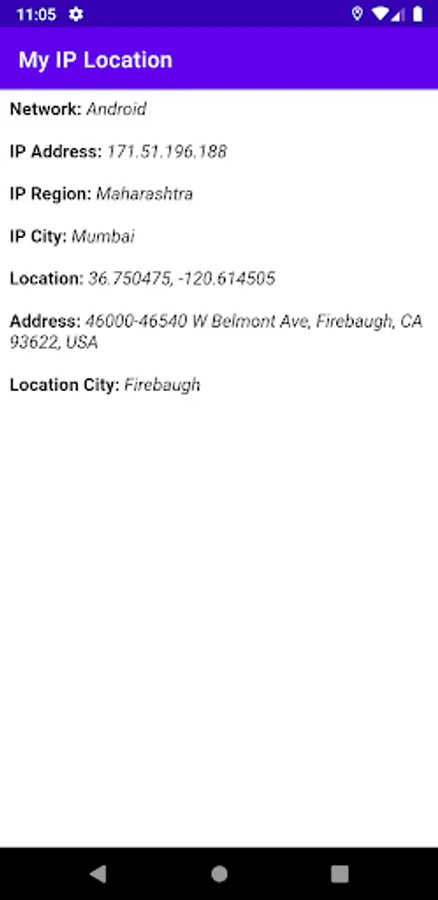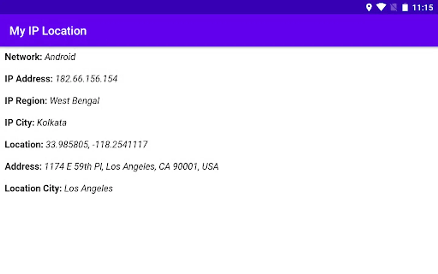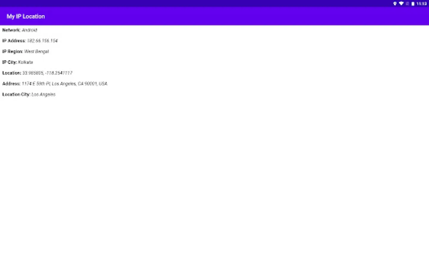 This app is made for knowing your public ip, ip's city, ip's state and location address, location lat long, location city