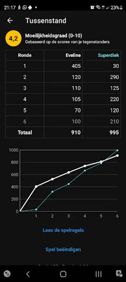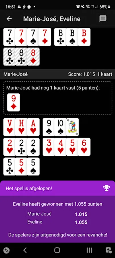 Once you have laid out all the cards, the scores are added up: that which is on the table minus the cards that you still have in your hand. As soon as one of the players has 1000 points or more at the end of a round, they have won the game.